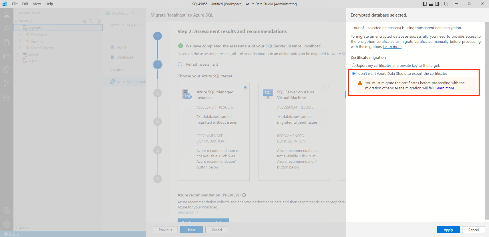 Om du inte vill ha migreringsguiden kan du migrera TDE-aktiverade databaser. Välj Jag vill inte att Azure Data Studio ska exportera certifikaten. Hoppa över det här steget.