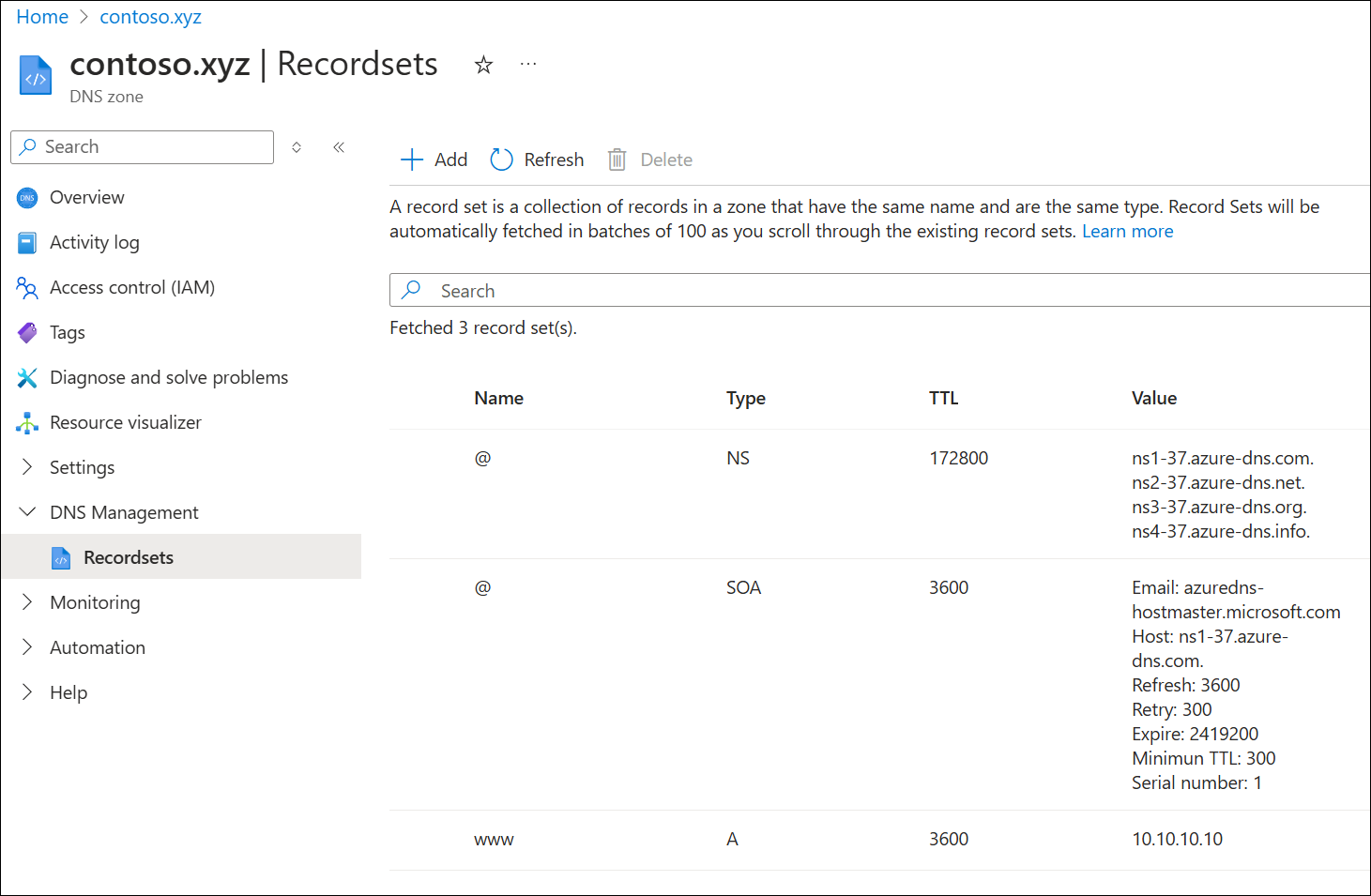 Öppna contoso.xyz DNS-zonen under Resurser i Azure-portalen.
