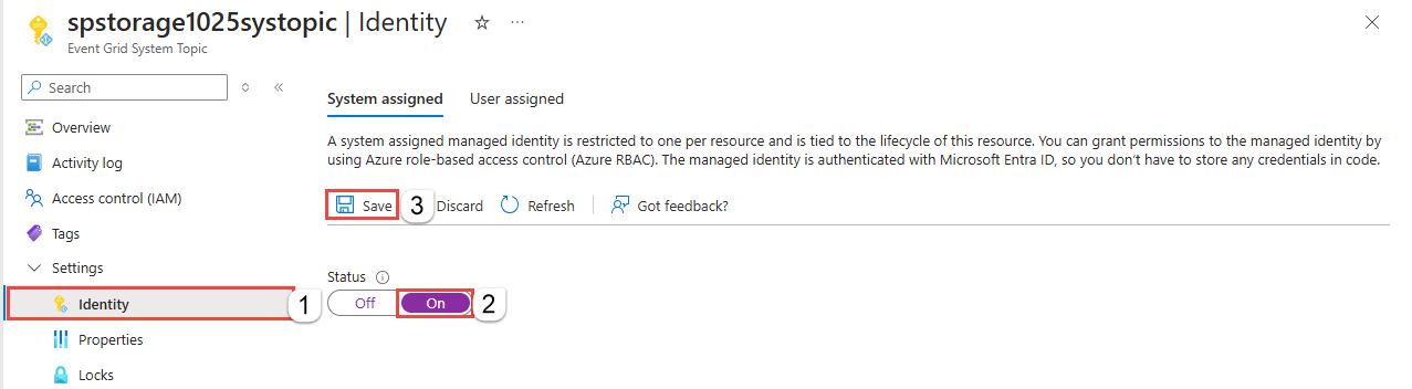 På sidan Systemämne för Event Grid väljer du Identitet under Inställningar på den vänstra navigeringsmenyn.