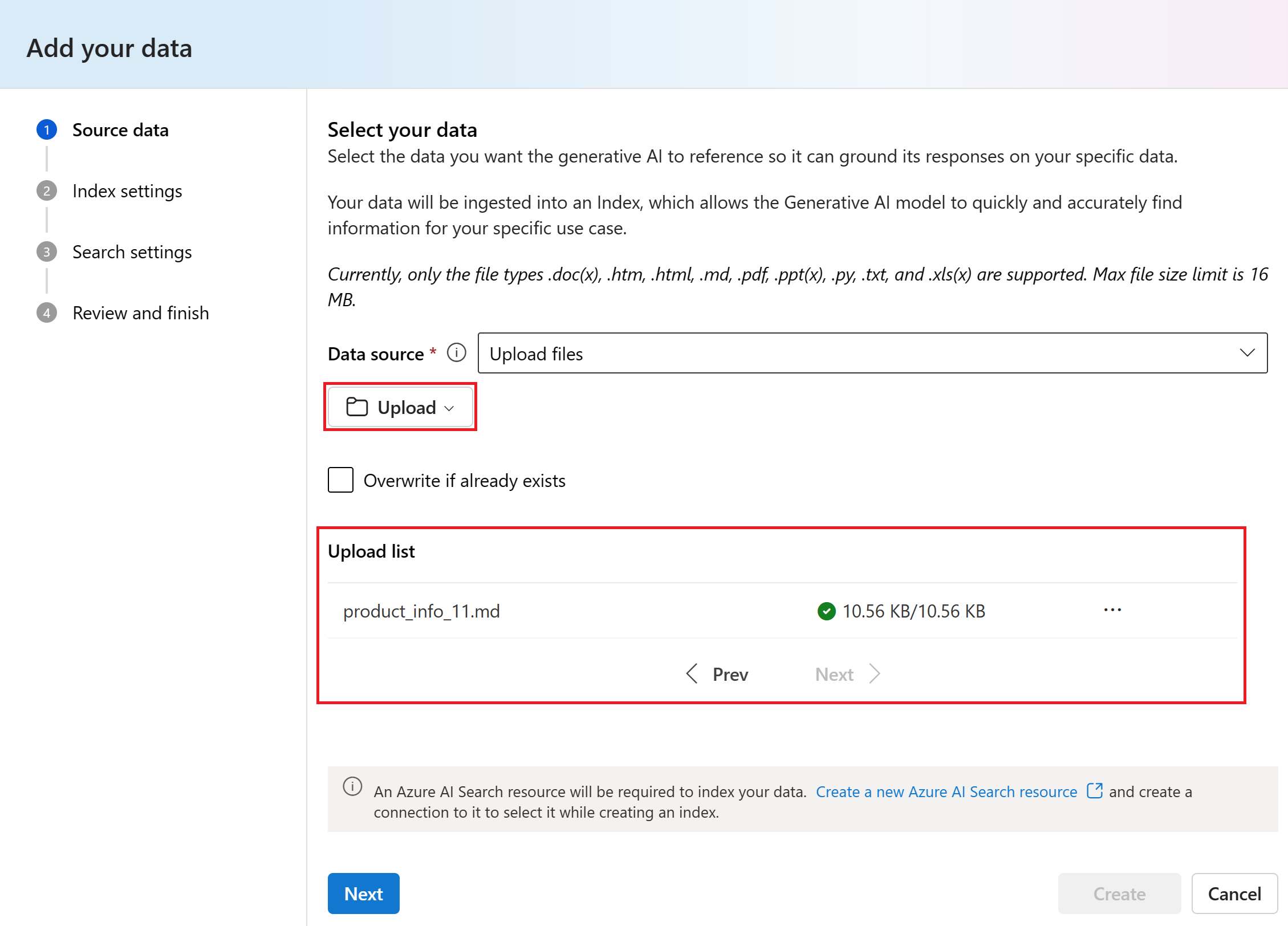 Välj Upload för att ladda upp filen till ditt Azure Blob storage konto. Välj sedan Nästa.