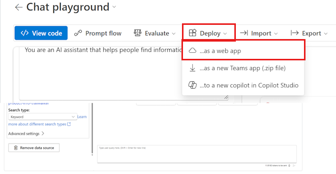 Slutför stegen i föregående avsnitt för att lägga till dina data på lekplatsen. Du kan distribuera en webbapp med eller utan egna data, men du behöver en distribuerad modell enligt beskrivningen i snabbstarten för Foundry Playground.