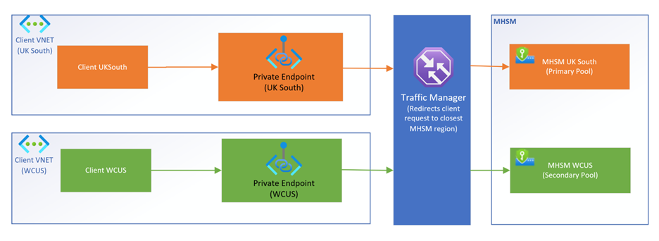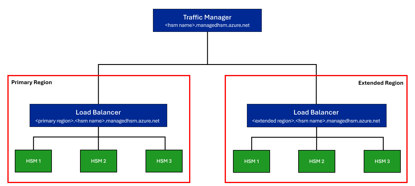 När replikering i flera regioner är aktiverad på en hanterad HSM skapas en andra hanterad HSM-pool med tre belastningsutjämnings-HSM-partitioner i en utökad region. När begäranden utfärdas till den globala DNS-slutpunkten <hsm-name>.managedhsm.azure.neti Traffic Manager tar den närmaste tillgängliga regionen emot och uppfyller begäran. Varje region har regional hög tillgänglighet individuellt på grund av fördelningen av HSM:er i regionen, men trafikhanteraren ser till att även om alla partitioner av en hanterad HSM i en region inte är tillgängliga på grund av en katastrof, hanteras begäranden fortfarande av den hanterade HSM-poolen i den utökade regionen.