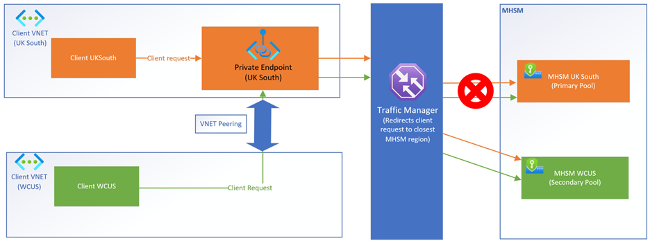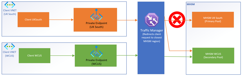 När en av de hanterade HSM:erna (uk south, som exempel) i ett replikerat scenario med flera regioner inte är tillgängligt med privata slutpunkter aktiverade, omdirigeras klientbegäranden till tillgänglig Hanterad HSM (USA, västra centrala). Klientbegäranden från UK south går först till den privata slutpunkten i UK south och dirigeras sedan till US west Central Managed HSM av trafikhanteraren.