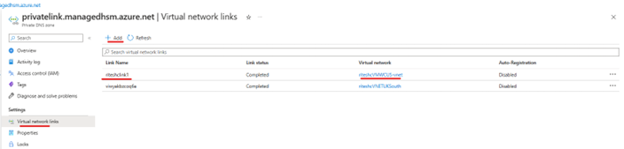 Hanterade HSM:er i primära och utökade regioner men bara en privat slutpunkt som konfigurerats i antingen den primära eller utökade regionen. För att en klient från ett annat virtuellt nätverk (VNET1) ska kunna ansluta till en hanterad HSM via en privat slutpunkt i ett annat virtuellt nätverk (VNET2) krävs peering för virtuella nätverk mellan de två virtuella nätverken. Du kan lägga till länken för virtuellt nätverk för den privata DNS-zonen som skapas när den privata slutpunkten skapas.