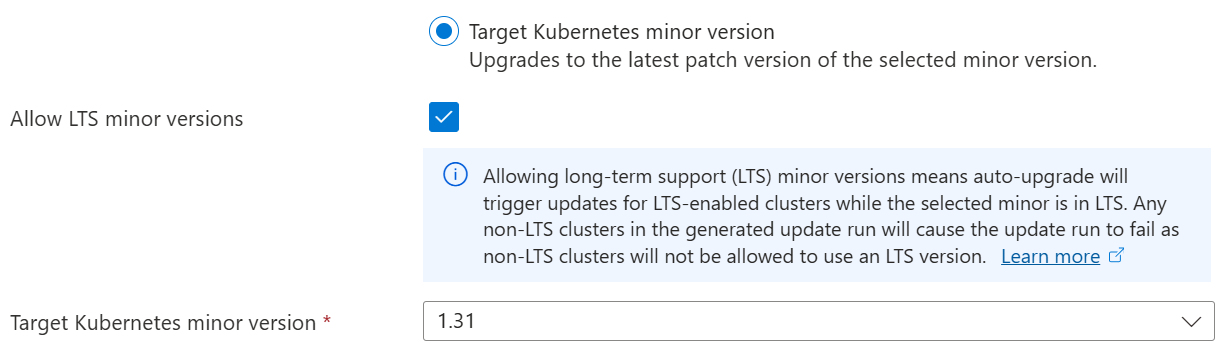 Tillåt LTS-delversioner stöder endast uppdateringskörningar med alla kluster med LTS aktiverat. Om du stöter på ett icke-LTS-kluster misslyckas uppdateringskörningen.