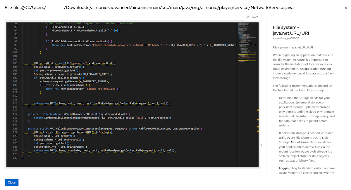 Verktyget identifierar användning av programteknik via statisk kodanalys, ger uppskattning av arbete och påskyndar kodomläggning. Den här utvärderingen hjälper dig att prioritera och flytta Java-program till Azure. Med en uppsättning motorer och regler kan verktyget identifiera och utvärdera olika tekniker som Java 11, Java 17, Jakarta EE, Spring, Hibernate, Java Message Service (JMS) med mera. Verktyget hjälper dig sedan att omplatforma Java-programmet till olika Azure-mål – Azure App Service, Azure Kubernetes Service och Azure Container Apps – med specifika Azure-omplatformningsregler.