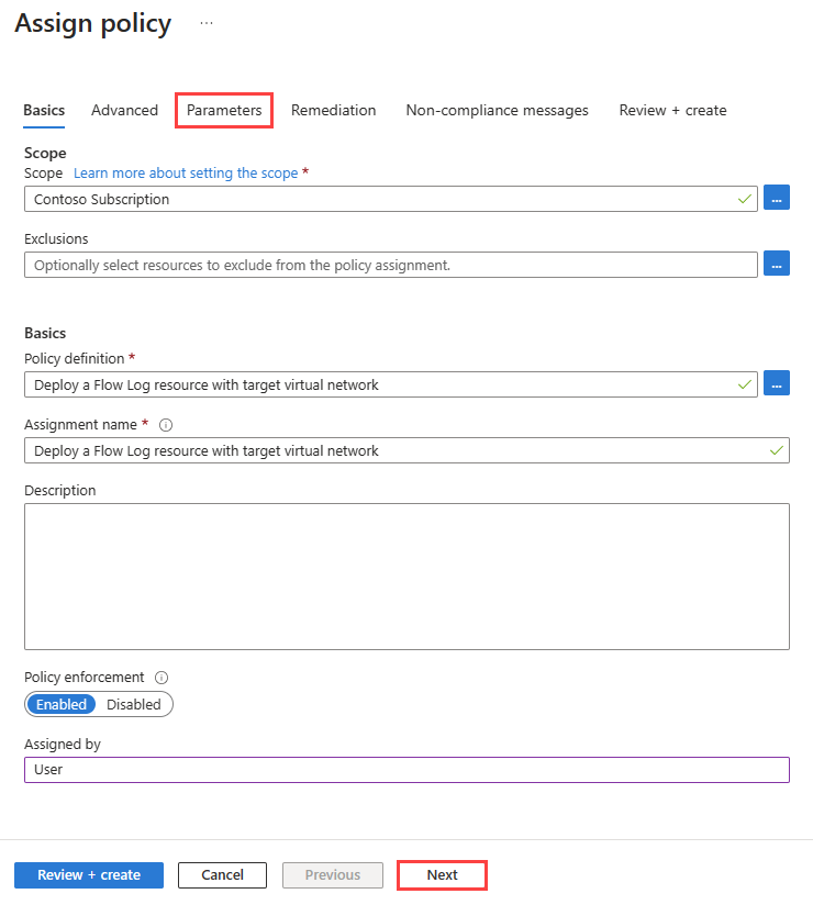 Inställning Värde Effekt Välj DeployIfNotExists för att aktivera körningen av policyn. Det andra tillgängliga alternativet är: Inaktiverad. Virtuell nätverksregion Välj den region i det virtuella nätverk som du riktar in dig med policyn. Lagringskonto Välj lagringskontot. Lagringskontot måste finnas i samma region som det virtuella nätverket. Network Watcher RG Välj resursgruppen för din Network Watcher-instans. Flödesloggarna som skapas av principen sparas i den här resursgruppen. Bevakare av nätverk Välj Network Watcher-instansen för den valda regionen. Antal dagar för att behålla flödesloggar Välj det antal dagar som du vill behålla flödesloggdata i lagringskontot. Standardvärdet är 30 dagar. Om du inte vill tillämpa någon kvarhållningsprincip anger du 0. Välj Nästa eller fliken Reparation .