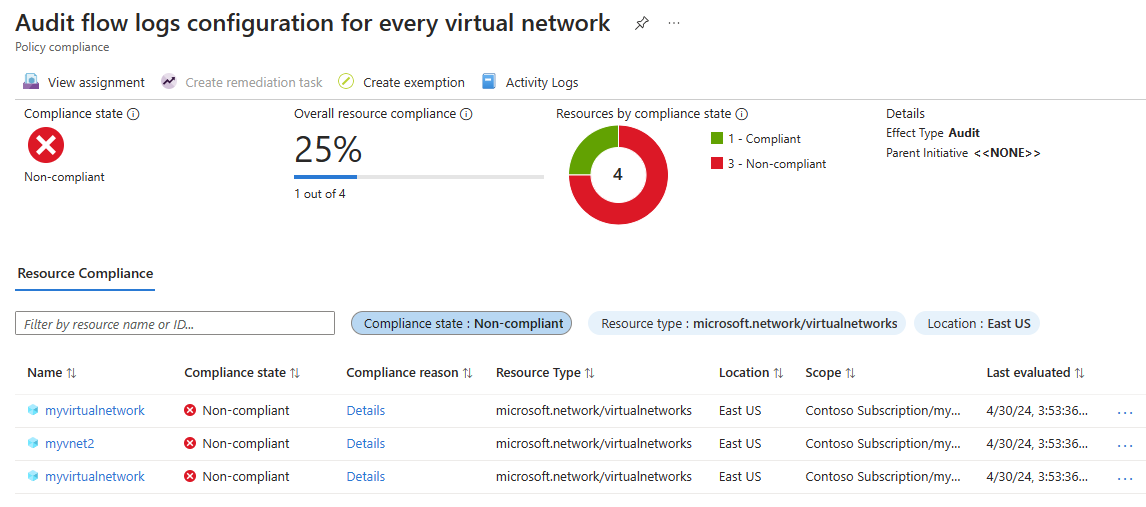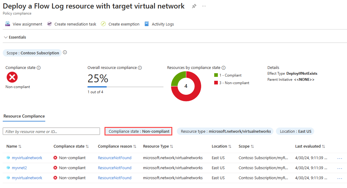 Policyn tar lite tid på sig att utvärdera virtuella nätverk inom det angivna området och distribuera flödesloggar för de icke överensstämmande virtuella nätverken.
