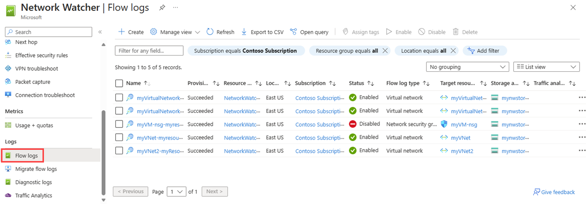 Gå till Flödesloggar under Loggar i Network Watcher för att se flödesloggarna som har skapats av policyn.