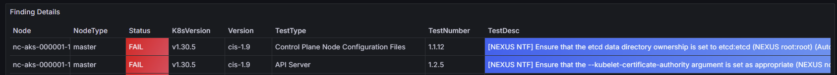Operatorn Nexus Cluster Manager är en AKS-implementering. Följande bild visar undantag i Kube-Bench för Klusterhanteraren. En fullständig rapport över CIS Benchmark-kontrollutvärdering för Azure Kubernetes Service (AKS) finns här