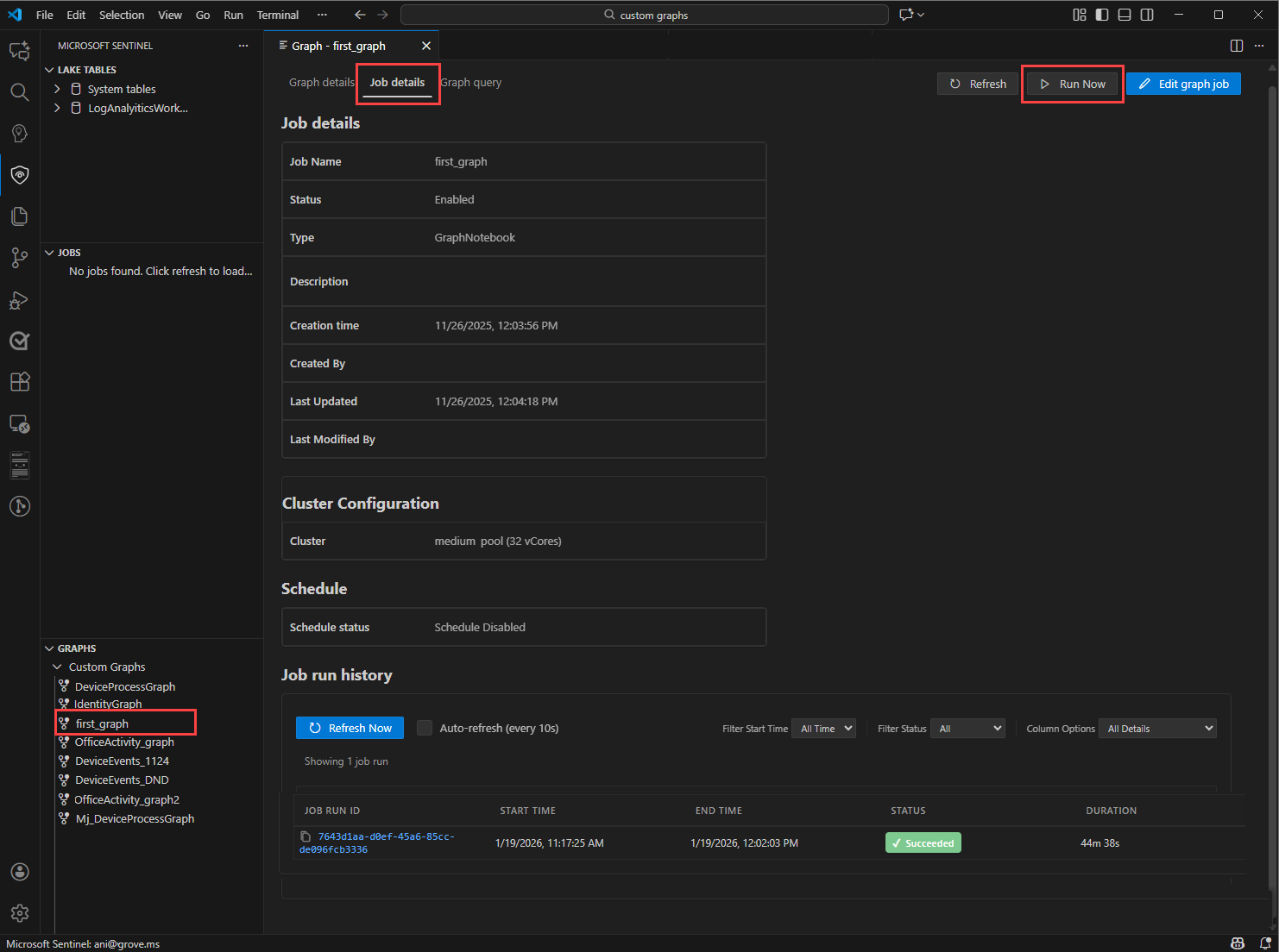 När du har skapat grafkoden i notebook-filen kan du köra anteckningsboken i en interaktiv session eller schemalägga ett diagramjobb. Diagram som skapas under den interaktiva notebook-sessionen är tillfälliga och är endast tillgängliga i kontexten för notebook-sessionen. Om du vill spara grafen och dela med ditt team schemalägger du ett diagramjobb för att återskapa grafen ofta. När grafen har sparats är den tillgänglig från: grafupplevelsen i Microsoft Defender-portalen under Sentinel, Visual Studio Code Notebooks och Graph-fråge-API:er.