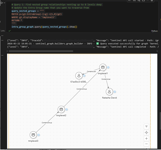 # Build the graph from the spec - this will validate the spec and prepare it for querying # Alter options is to use Graph.prepare() to prepare the graph nodes and edges in the lake # and then use Graph.publish() to create the graph. You would typically call prepare() and publish() # seperately to understand the cost of Graph API calls that are triggeterd by Graph.publish() # see https://learn.microsoft.com/azure/sentinel/billing?tabs=simplified%2Ccommitment-tiers intra_group_graph = Graph.build(entra_group_graph_spec)Anmärkning