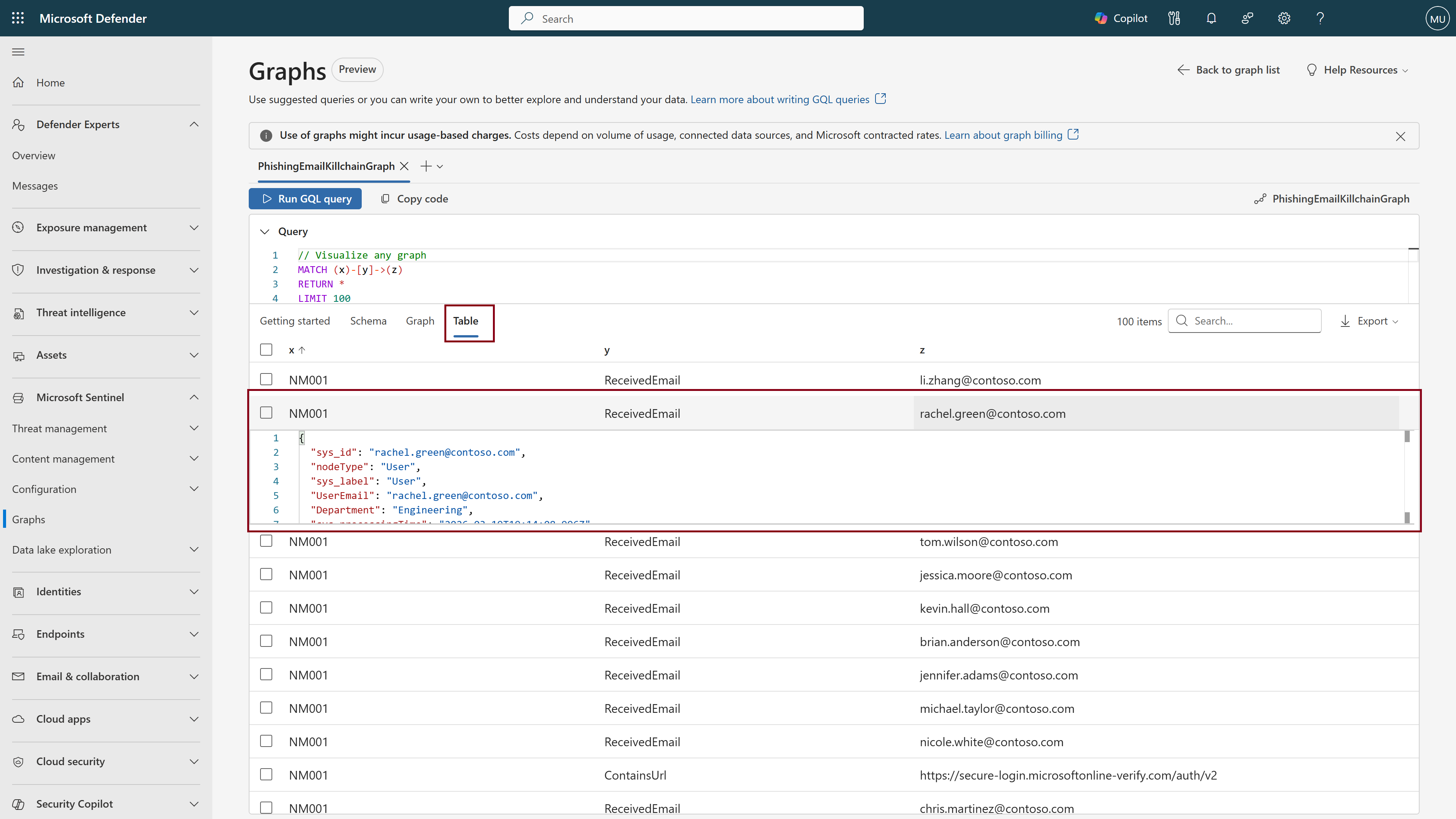 Med grafupplevelsen i Microsoft Defender-portalen kan du utföra interaktiva grafbaserade undersökningar på dina anpassade grafer, till exempel genom att använda ett diagram som skapats för nätfiskeanalys som hjälper dig att snabbt utvärdera effekten av en incident nyligen, profilera angriparen och spåra dess sökvägar i Microsofts telemetri och data från tredje part. Med den här upplevelsen kan du köra graffrågor för att visualisera de insikter som är viktigast för din organisation och stöder ad hoc-bläddering av grafen så att du snabbt kan undersöka entiteter av intresse. Du kan studera grafschemat för att förstå de relationer som definierats i diagrammet och använda någon av de metadata som visas för att begränsa dina resultat. Du kan snabbt verifiera dina resultat med tabellvyn och exportera dem för enkel integrering i befintliga arbetsflöden. Använd Jupyter Notebooks i Microsoft Visual Studio Code för att skapa och materialisera dina anpassade grafer och använd sedan grafupplevelsen i Microsoft Sentinel för att fråga efter och visualisera dina anpassade grafer.