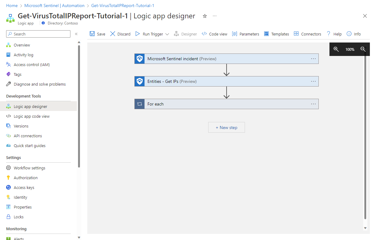 Redigera spelboksnamnet genom att lägga till i slutet av det föreslagna namnet "Get-VirusTotalIPReport". På så sätt kan du se vilken originalmall den här spelboken kommer från, samtidigt som du ser till att den har ett unikt namn om du vill skapa en annan spelbok från samma mall. Vi kallar det "Get-VirusTotalIPReport-Tutorial-1".