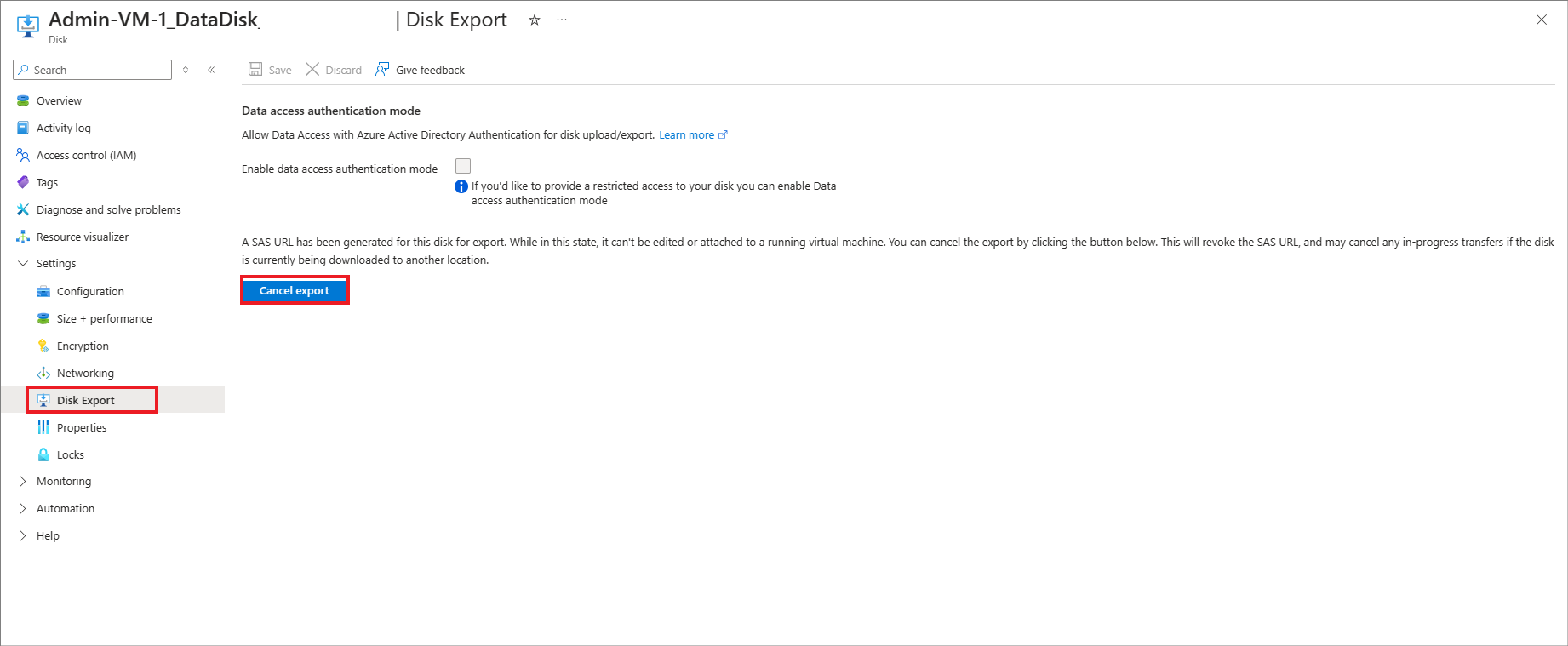Azure Site Recovery behöver SAS på replikdiskar för replikering. Att avbryta exporten kan kort påverka replikeringen av Azure Site Recovery, men Site Recovery återställer automatiskt SAS-nyckeln inom några minuter.