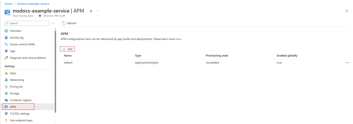 Om du vill skapa en APM-konfiguration väljer du Lägg till. Om du vill aktivera APM-konfigurationen globalt väljer du Aktivera globalt. Alla efterföljande versioner och distributioner använder APM-konfigurationen automatiskt.