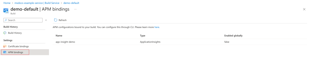 På sidan APM-bindningar visar du APM-konfigurationerna som är bundna till bygget.