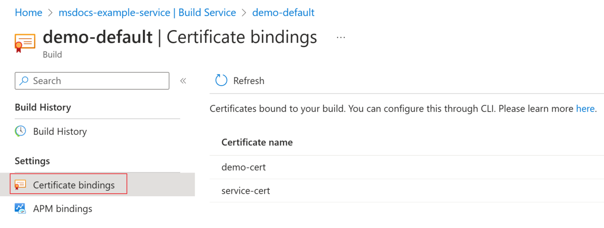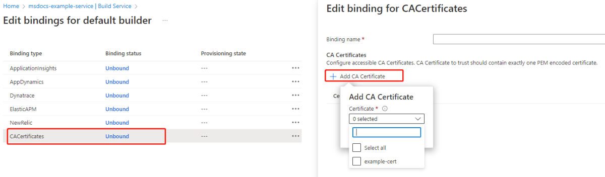 - Du kan hantera offentliga certifikat i TLS/SSL-inställningarna och binda CA-certifikat via bindningar i byggaren. Mer information finns i avsnittet Hantera bindningar i builder i Azure Spring Apps (inaktuell).