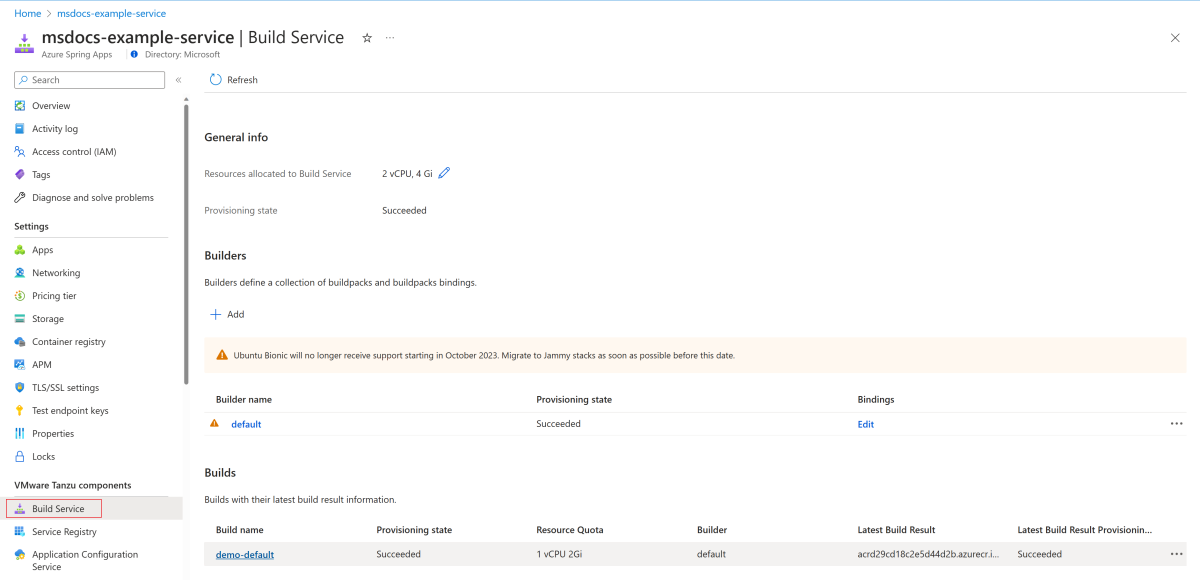 Gå till sidan Byggtjänst för din Azure Spring Apps-instans.
