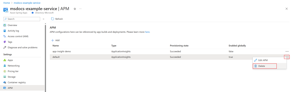 Om du vill ta bort en APM-konfiguration väljer du ellipsknappen (...) för konfigurationen och väljer sedan Ta bort. Om APM-konfigurationen används av någon version eller distribution kan du inte ta bort den.