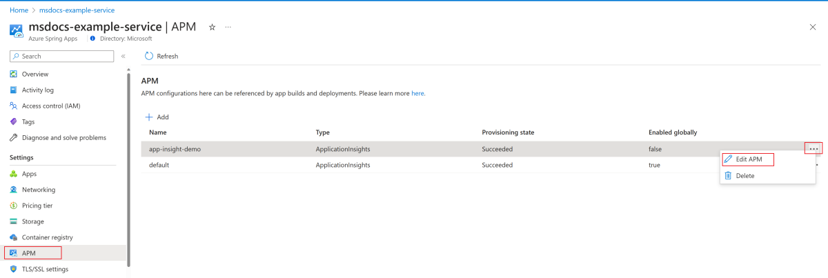I de flesta fall finns det bara en APM som är konfigurerad i bindningarna i standardbyggaren. Du kan skapa en ny APM-konfiguration med samma konfiguration i bindningar och aktivera den här APM-konfigurationen globalt. Alla efterföljande versioner och distributioner använder den här konfigurationen automatiskt. Använd följande steg för att migrera: