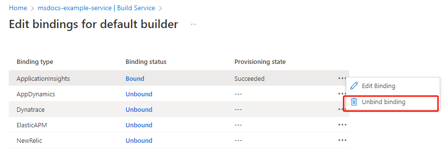 Om du vill avbinda en buildpack-bindning genom att redigera bindningsegenskaper väljer du Redigera bindning och sedan Ta bort bindning.