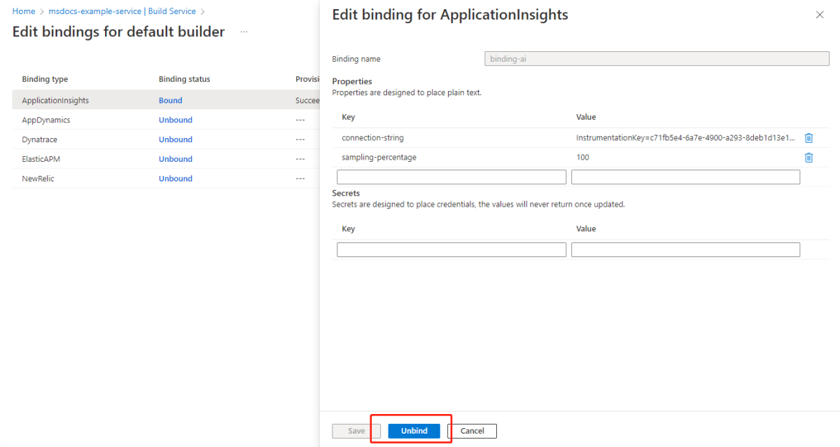 Du kan avbinda en buildpack-bindning med hjälp av bindningskommandot Unbind eller genom att redigera bindningsegenskaperna.