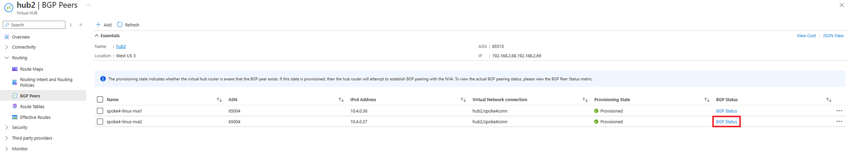 Kontrollera att BGP-peering med hubben har konfigurerats korrekt och fungerar innan du försöker ange ett anpassat nästa hopp. Anvisningar om hur du konfigurerar BGP-peering med hubben finns här.