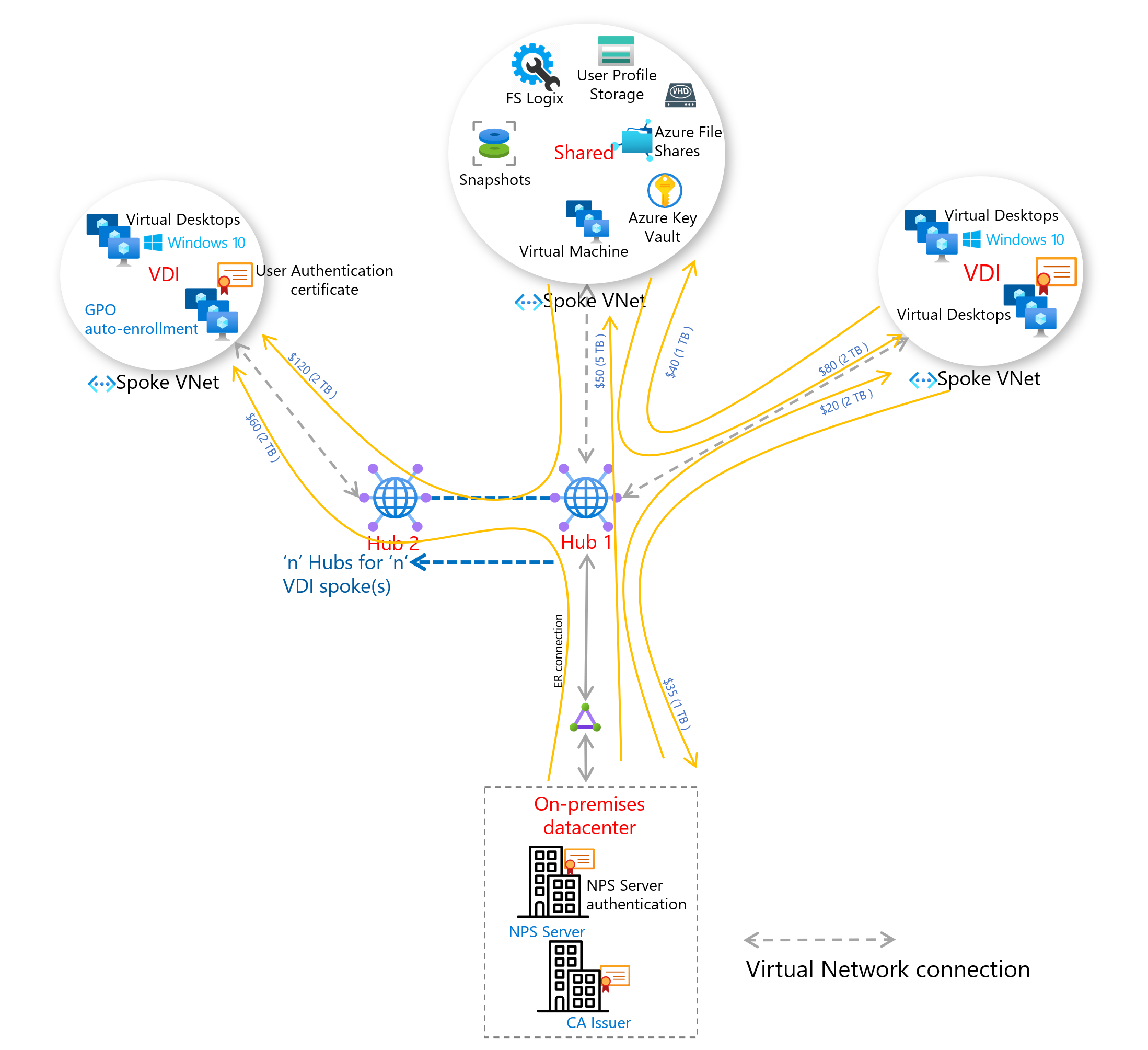 Följande diagram visar de typiska datavägarna i ett nätverk som involverar Virtual WAN och de olika komponenterna i prissättningen per timme och per GB.