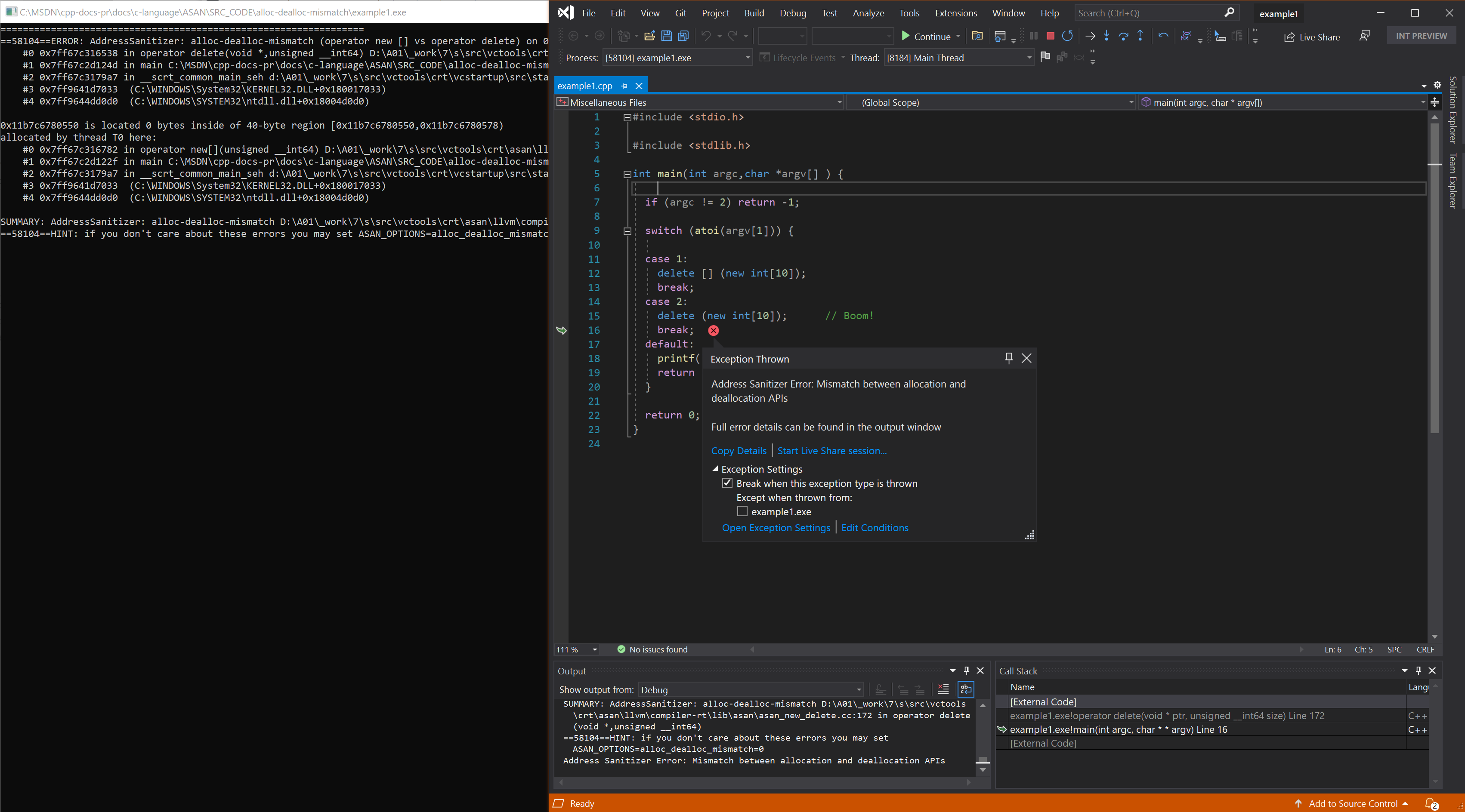 I en kommandotolk för Visual Studio 2019 version 16.9 eller senare kör du följande kommandon för att se ett exempel på alloc_dealloc_mismatch: