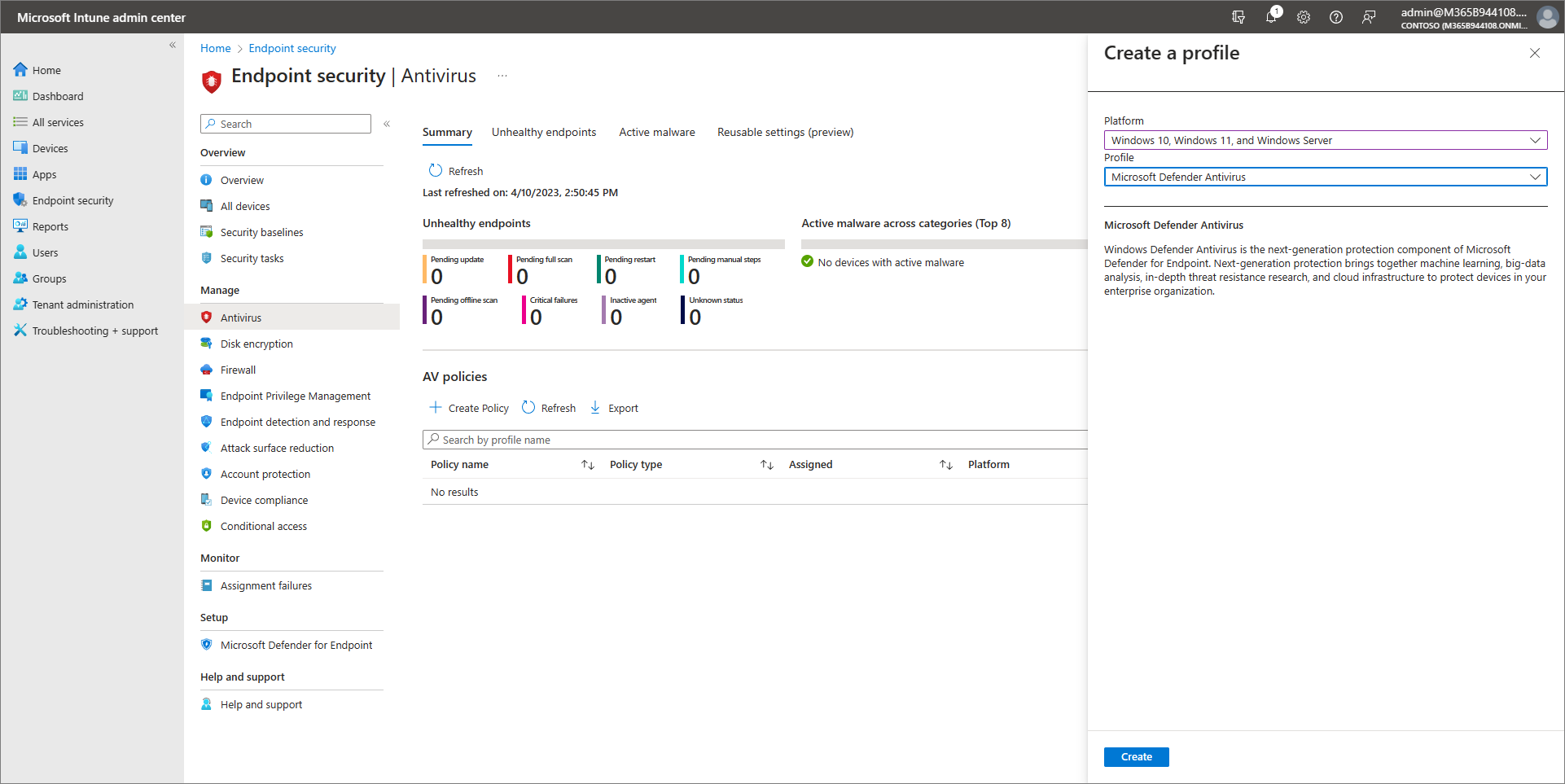 I Microsoft Intune administrationscenter (https://intune.microsoft.com) går du till Endpoint Security>Antivirus.