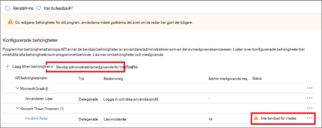 Välj Bevilja administratörsmedgivande. Varje gång du lägger till en behörighet måste du välja Bevilja administratörsmedgivande för att den ska börja gälla.