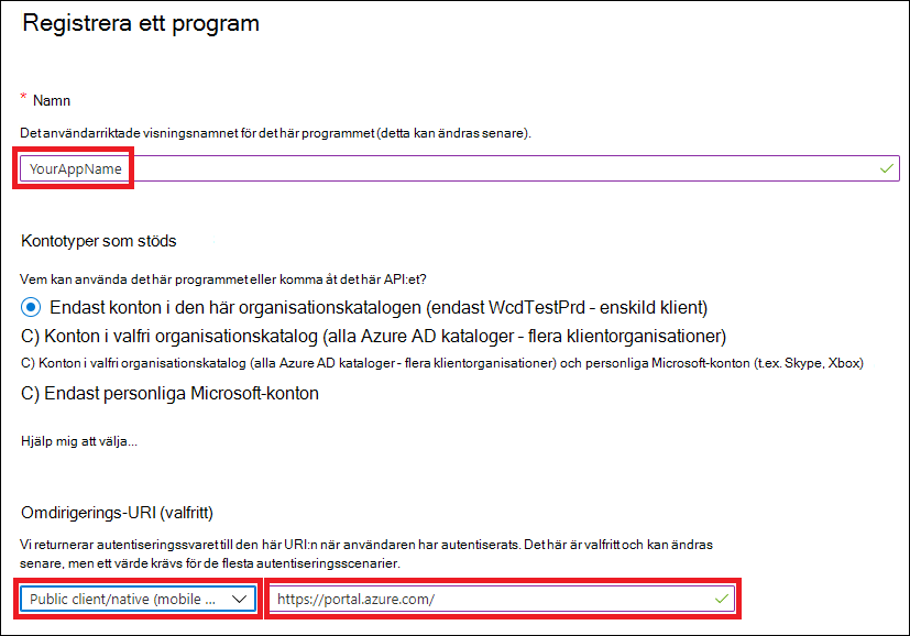 I formuläret väljer du ett namn för programmet och anger följande information för omdirigerings-URI:n och väljer sedan Registrera.