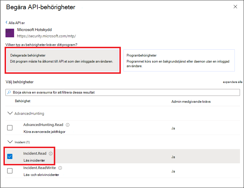 Välj Delegerade behörigheter. Välj relevanta behörigheter för ditt scenario (till exempel Incident.Read) och välj sedan Lägg till behörigheter.