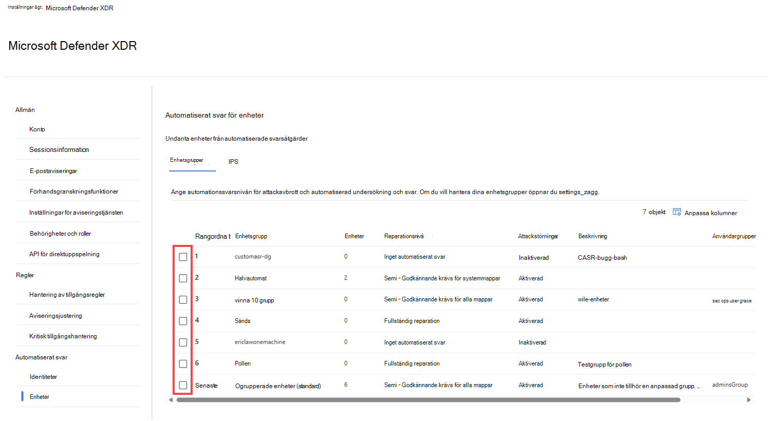 På fliken Enhetsgrupper väljer du en enhetsgrupp genom att markera kryssrutan bredvid gruppnamnet i listan för att konfigurera automatiseringsinställningar för angreppsstörningar.