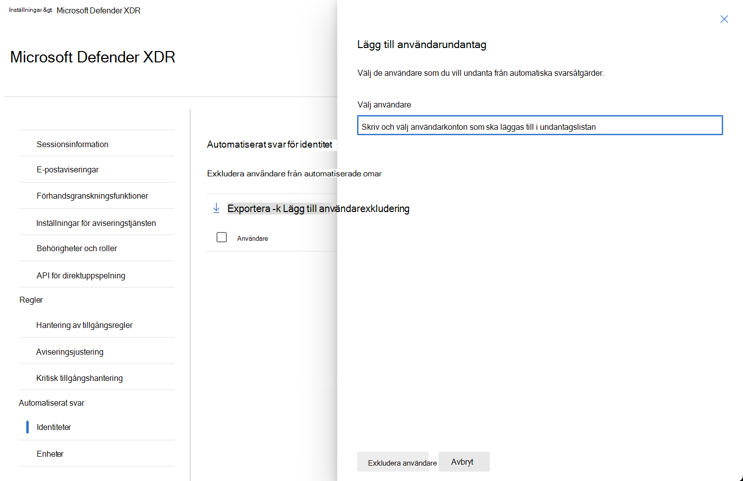 Om du vill exkludera ett användarkonto väljer du Lägg till användarundantag. Ett utfällt fönster visas.