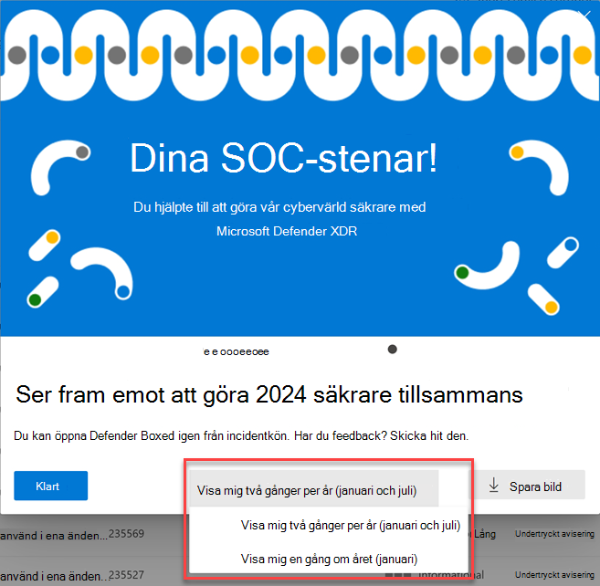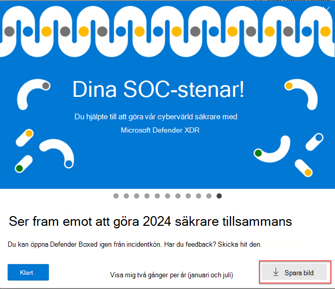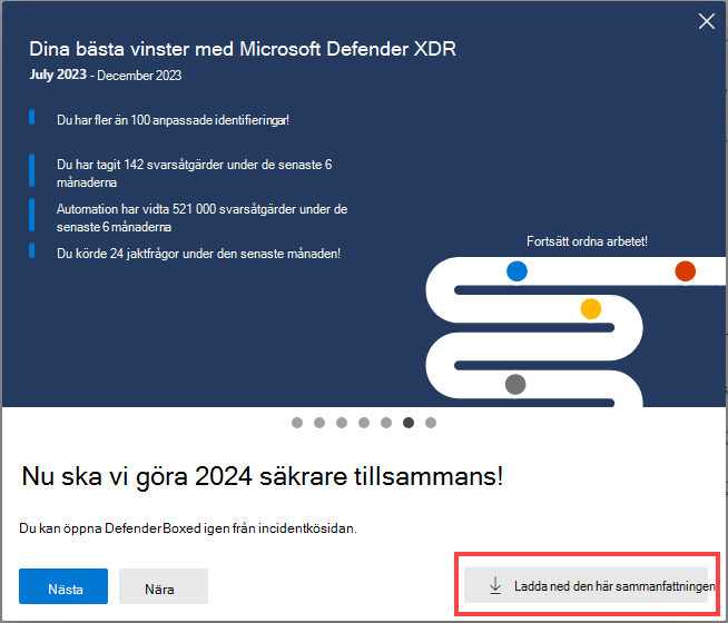 Under en begränsad tid under januari och juli varje år visas Defender Boxed automatiskt när du först öppnar incidentkön. Defender Boxed belyser organisationens säkerhetsframgång, förbättringar och svarsåtgärder under de senaste sex månaderna eller kalenderåret.