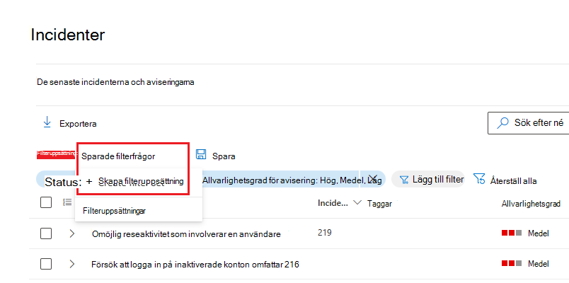 Du kan också skapa filteruppsättningar på incidentsidan genom att välja Sparade filterfrågor > Skapa filteruppsättning. Om inga filteruppsättningar har skapats väljer du Spara för att skapa en.