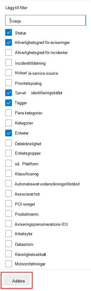 Välj de filter som du vill använda och välj sedan Lägg till. De valda filtren visas tillsammans med befintliga tillämpade filter. Välj det nya filtret för att ange dess villkor. Om du till exempel väljer filtret "Tjänst/identifieringskällor" väljer du det för att välja de källor som listan ska filtreras efter.