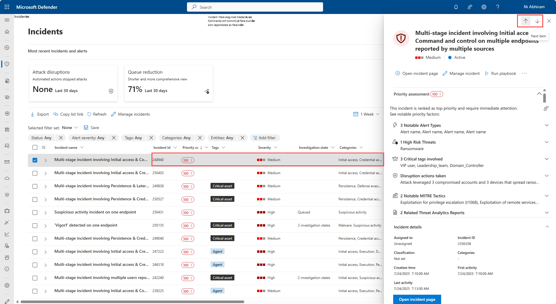 Välj incidentraden var som helst utom incidentnamnet för att visa ett sammanfattningsfönster med viktig information om incidenten. Fönstret innehåller prioritetsbedömningen, faktorer som påverkar prioritetspoängen, incidentens information, rekommenderade åtgärder och relaterade hot. Använd upp- och nedpilarna överst i fönstret för att navigera till föregående eller nästa incident i incidentkön. Mer information om hur du undersöker incidenten finns i Undersöka incidenter.