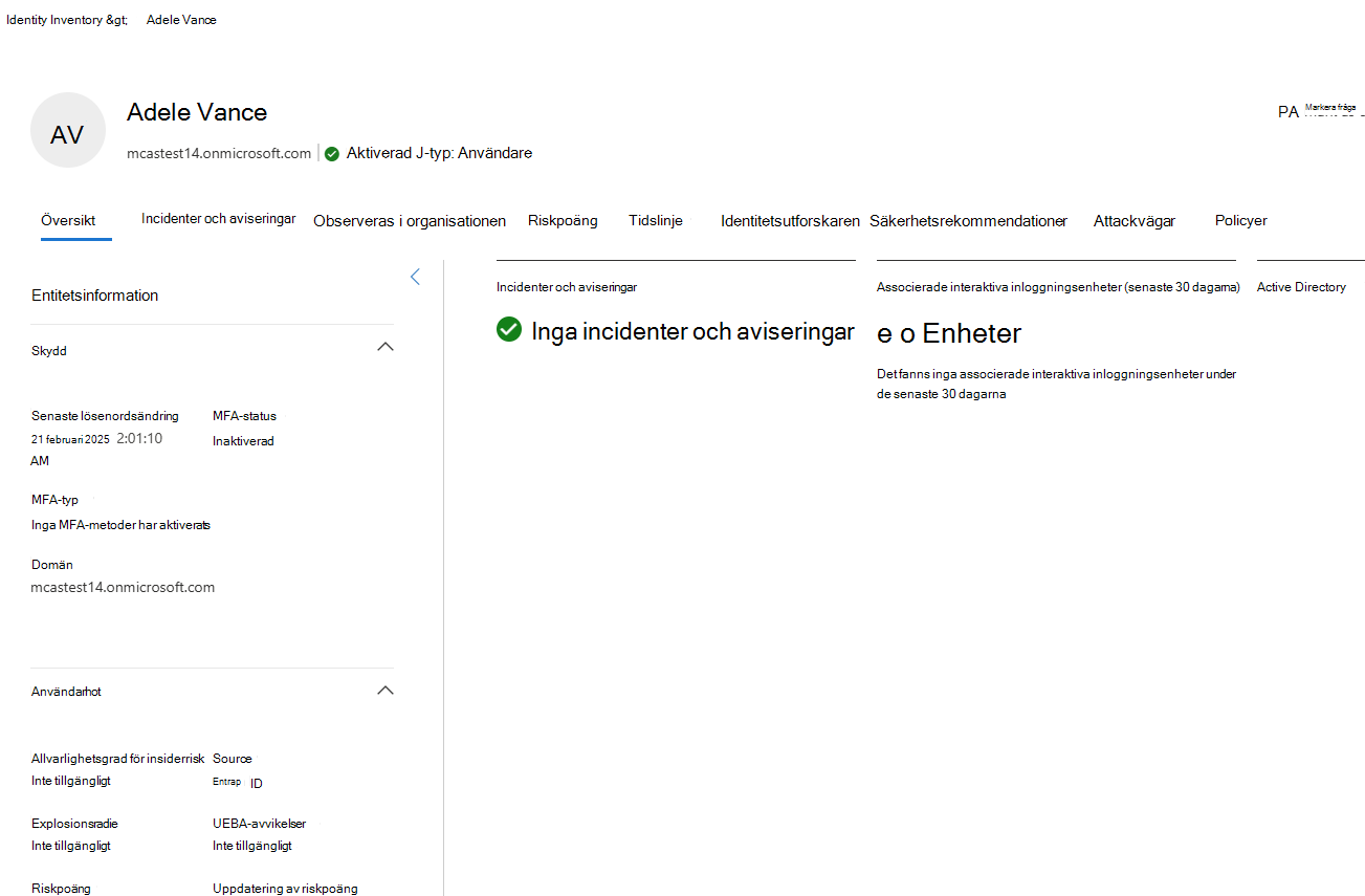Identitetssidan är ordnad i ett övre avsnitt och en uppsättning flikar. Det översta avsnittet visar identitetskontext, till exempel organisationsinformation och taggar, och innehåller menyn Åtgärder . Använd flikarna för att granska sammanfattningsinformation, relaterade aviseringar och djupare undersökningsvyer.