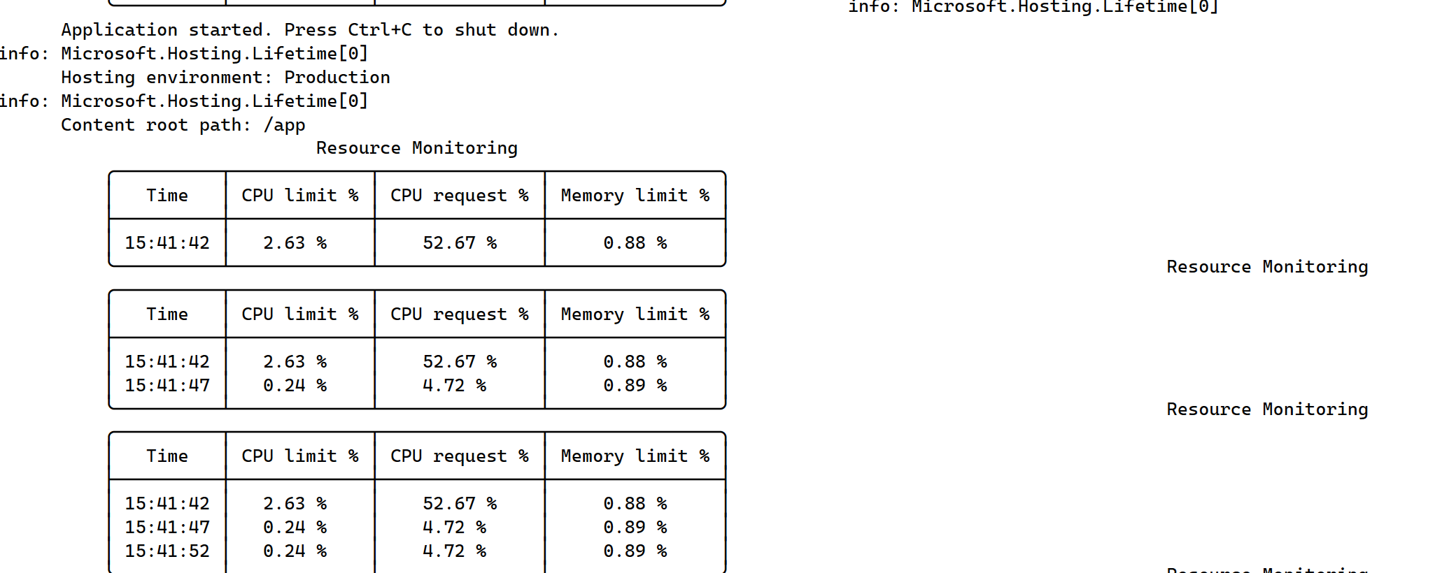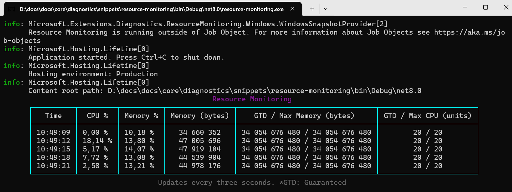 services.AddOpenTelemetry() .WithMetrics(builder => { builder.AddMeter("Microsoft.Extensions.Diagnostics.ResourceMonitoring"); builder.AddConsoleExporter(); // Or any other metrics exporter });Nu kan du observera resursanvändningsstatistiken via din konfigurerade måttexportör.