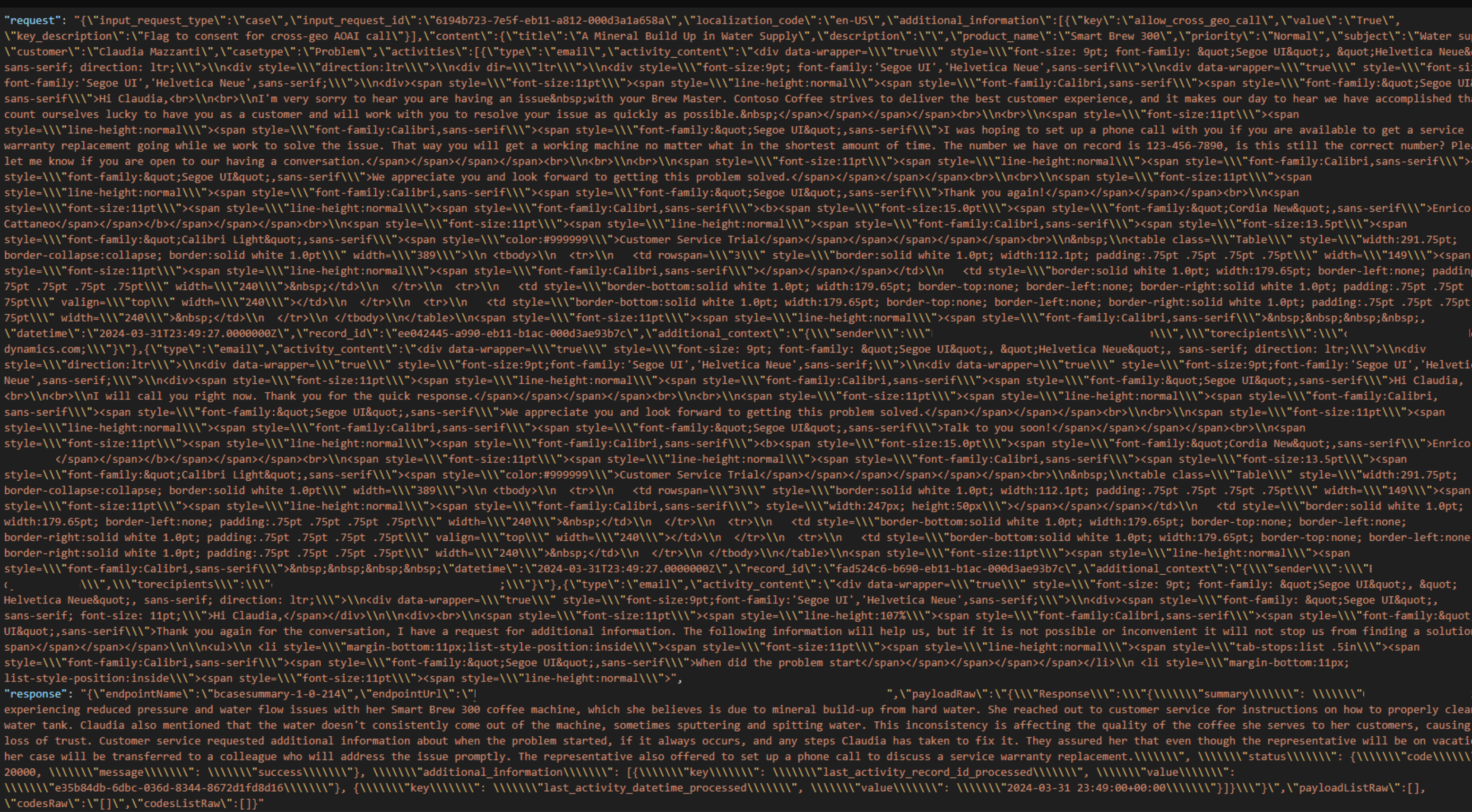 [Organization URI]/api/data/v9.1/msdyn_copilotinteractiondatas(f9d841e5-34e7-ee11-904c-000d3a3bb867)/msdyn_interactiondataAvkoda base64-kodade data för att hämta avskriften. Du kan använda ett base64-avkodningsverktyg online för att avkoda data. I vårt e-postexempel visas avkodade interaktionsdata på följande sätt.