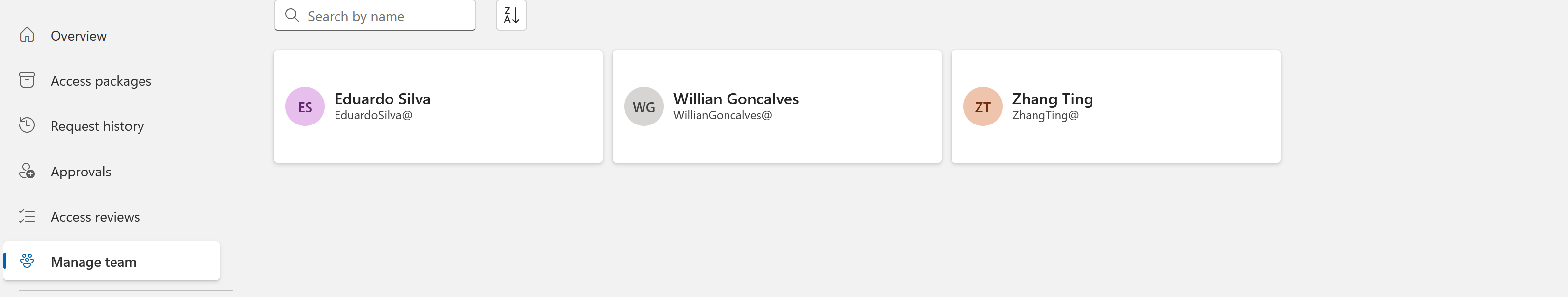 myaccess.microsoft.usdomänen i portallänken Min åtkomst .I den vänstra menyn väljer du Hantera team för att se en lista över dina direktrapporter.