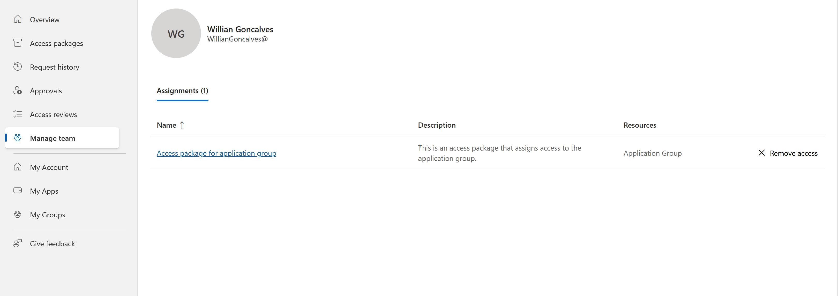 På sidan tilldelningar kan du se en lista över deras aktuella åtkomstpakettilldelningar. Du kan också välja Ta bort åtkomst för att avsluta den specifika åtkomstpakettilldelningen för användaren.