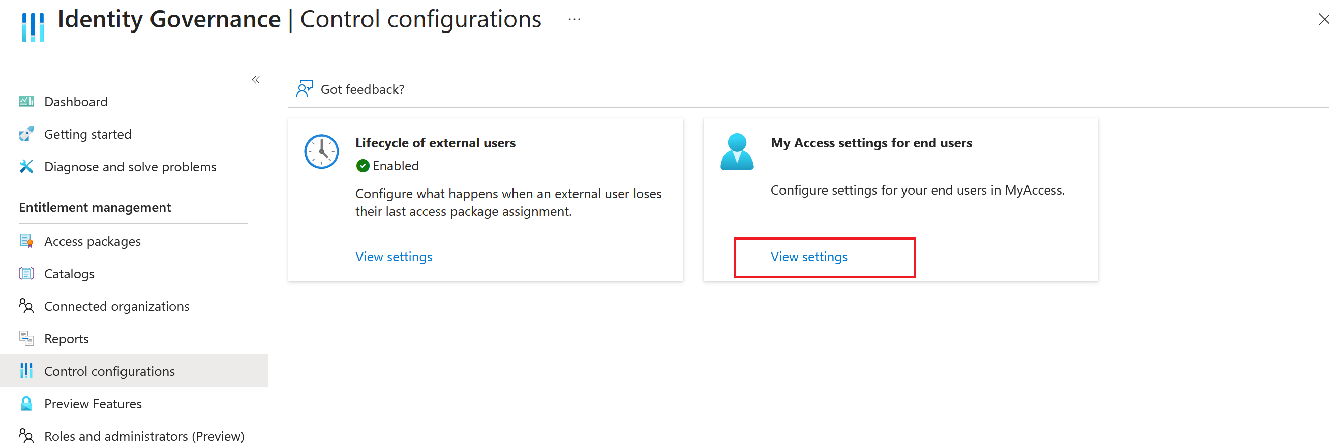 Bläddra till ID Governance>Behörighetshantering>Kontrollkonfigurationer.