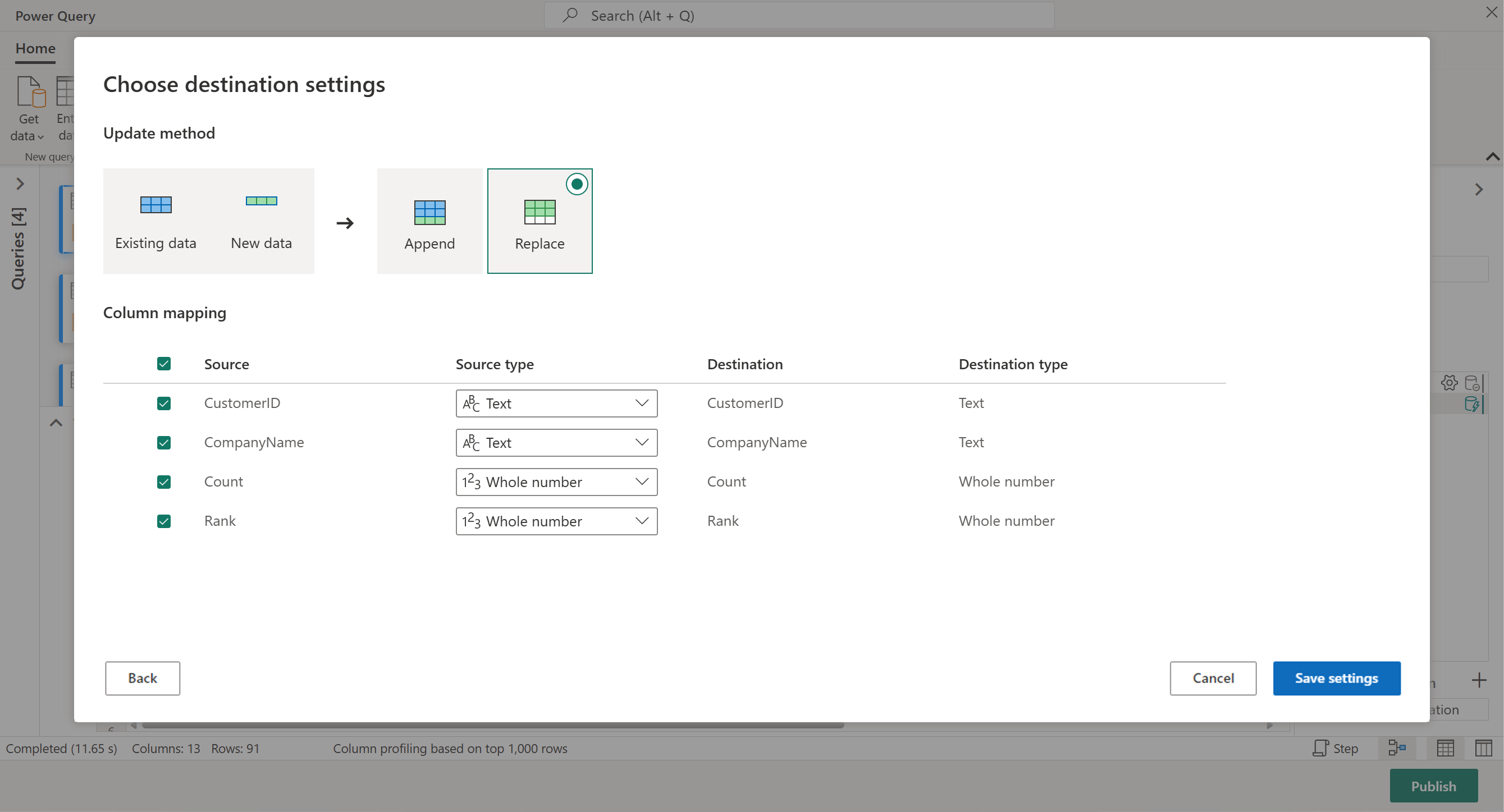 Du kan skicka dina resultat till ett sjöhus om du har ett eller hoppa över det här steget om du inte gör det. Här kan du välja vilken lakehouse och tabell som ska användas för dina data och välja om du vill lägga till nya data (Lägg till) eller ersätta det som finns där (Ersätt).