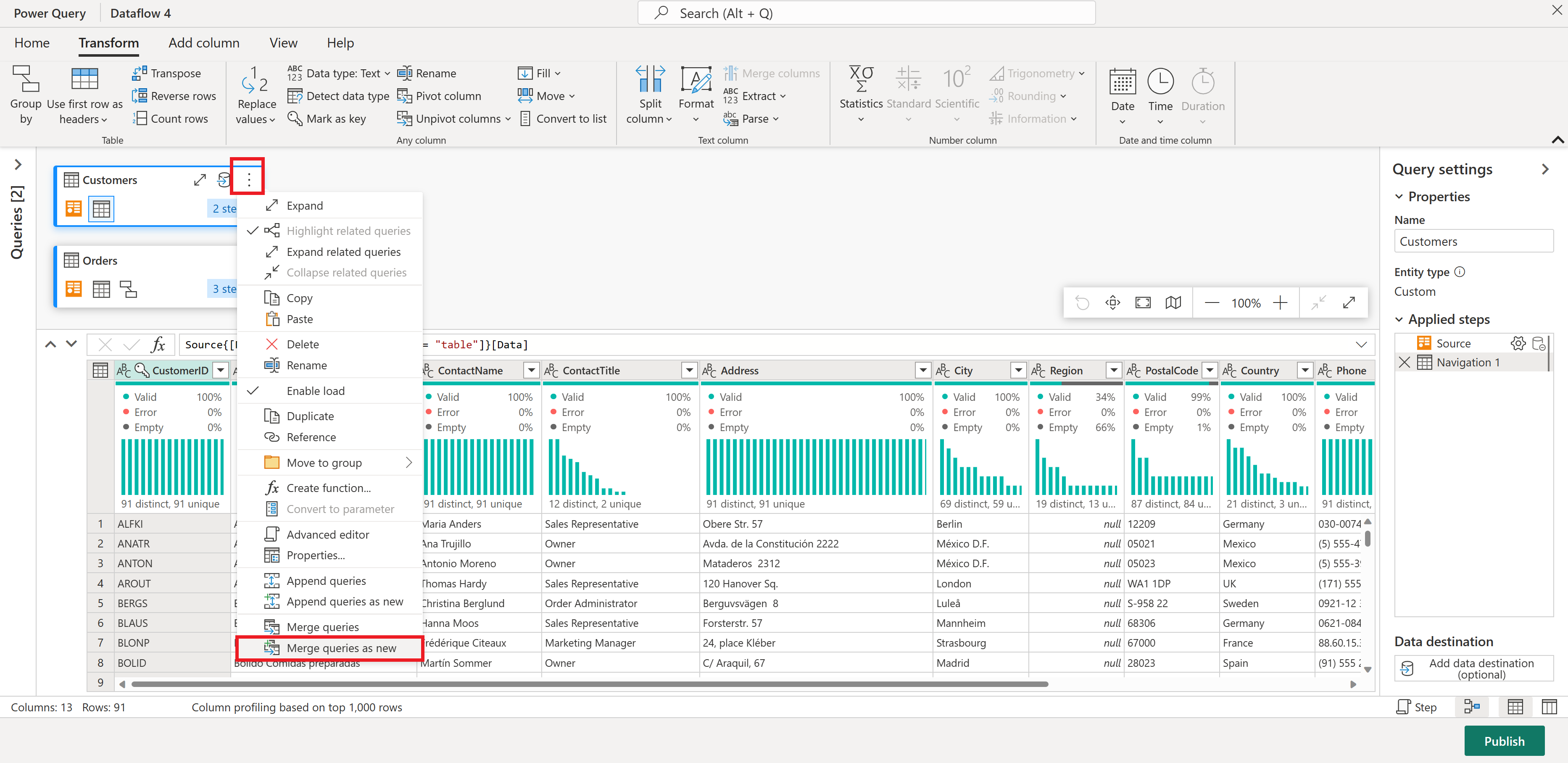 Sedan vill du kombinera data från tabellen Kunder med antalet beställningar per kund: Välj frågan Kunder i diagramvyn och använd menyn "⋮" för att komma åt sammanfoga frågor som ny transformering.
