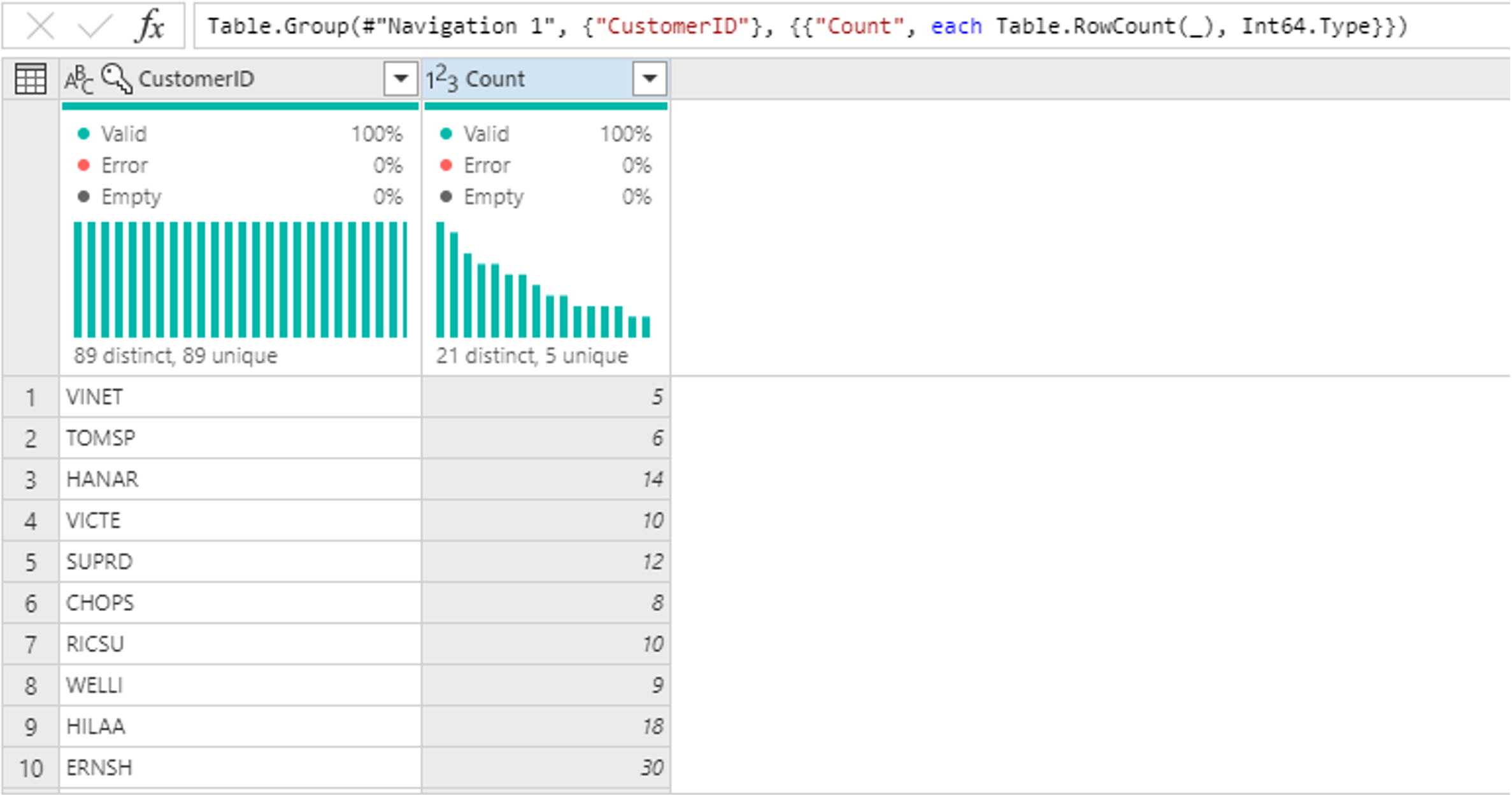 När vi har grupperat data i tabellen Beställningar hämtar vi en tabell med två kolumner med CustomerID och Count som kolumner.