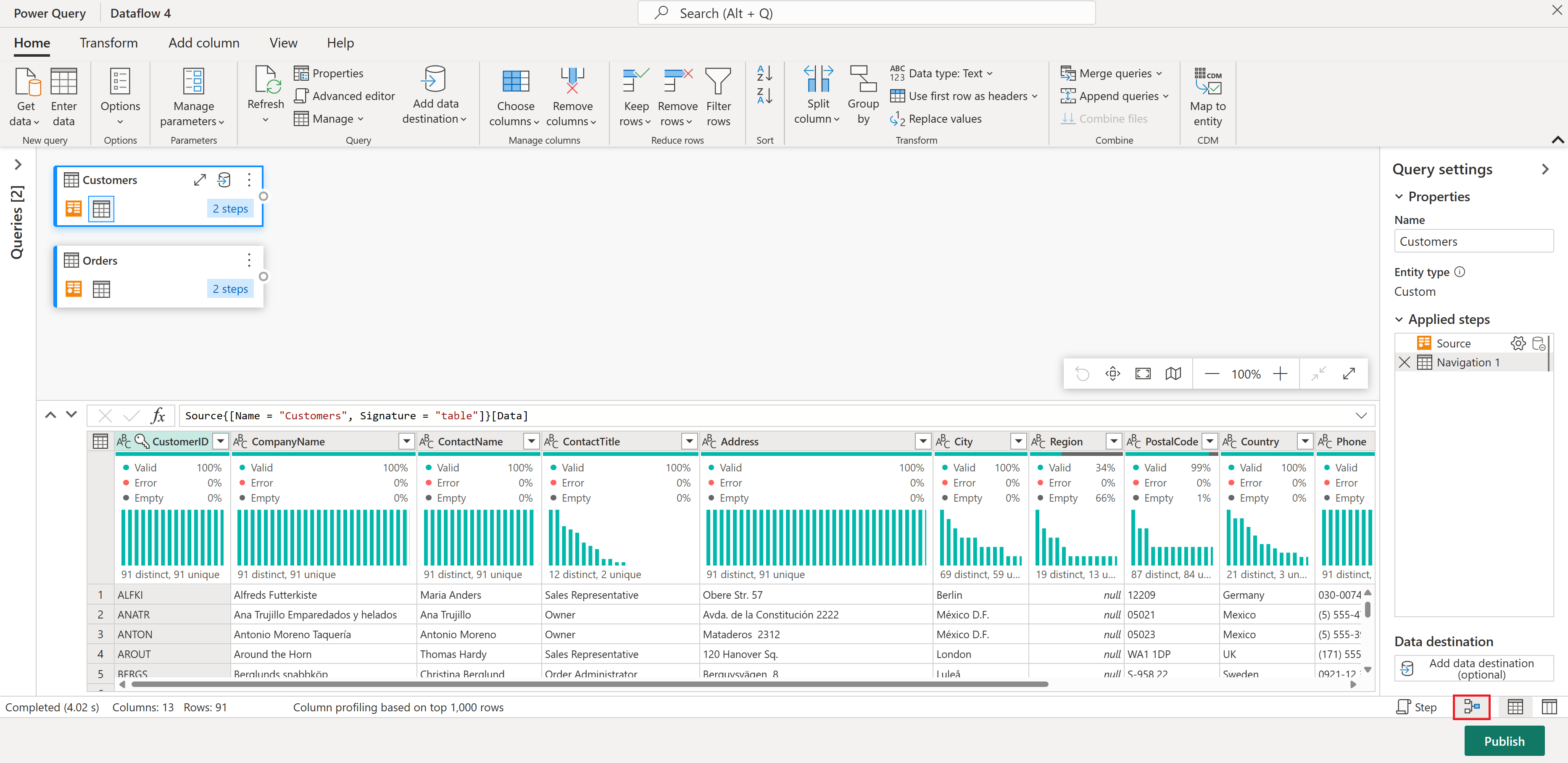 Nu ska vi fokusera på några få kolumner från tabellen Kunder. Det gör du genom att aktivera schemavyn genom att välja knappen schemavy i det nedre högra hörnet i dataflödesredigeraren.